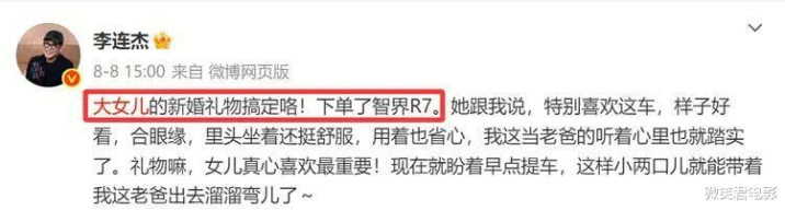 这让人不由想起了今年8月份,李连杰称送给大女儿的新婚礼物居然是一辆仅仅价值20多万的车。